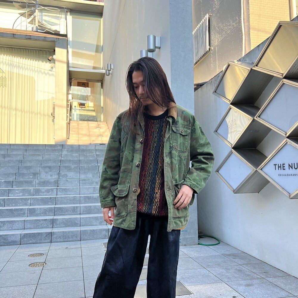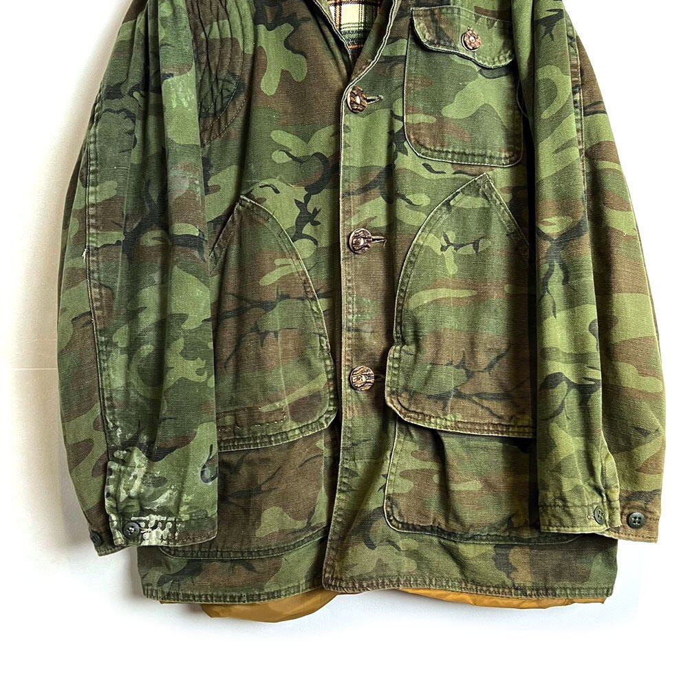 A 60s hunting jacket. The cotton duck fabric has become soft and worn over time, giving it a very nice texture. The camouflage color fades nicely, making this a great piece. A vintage hunting jacket with a good silhouette and a good fit.