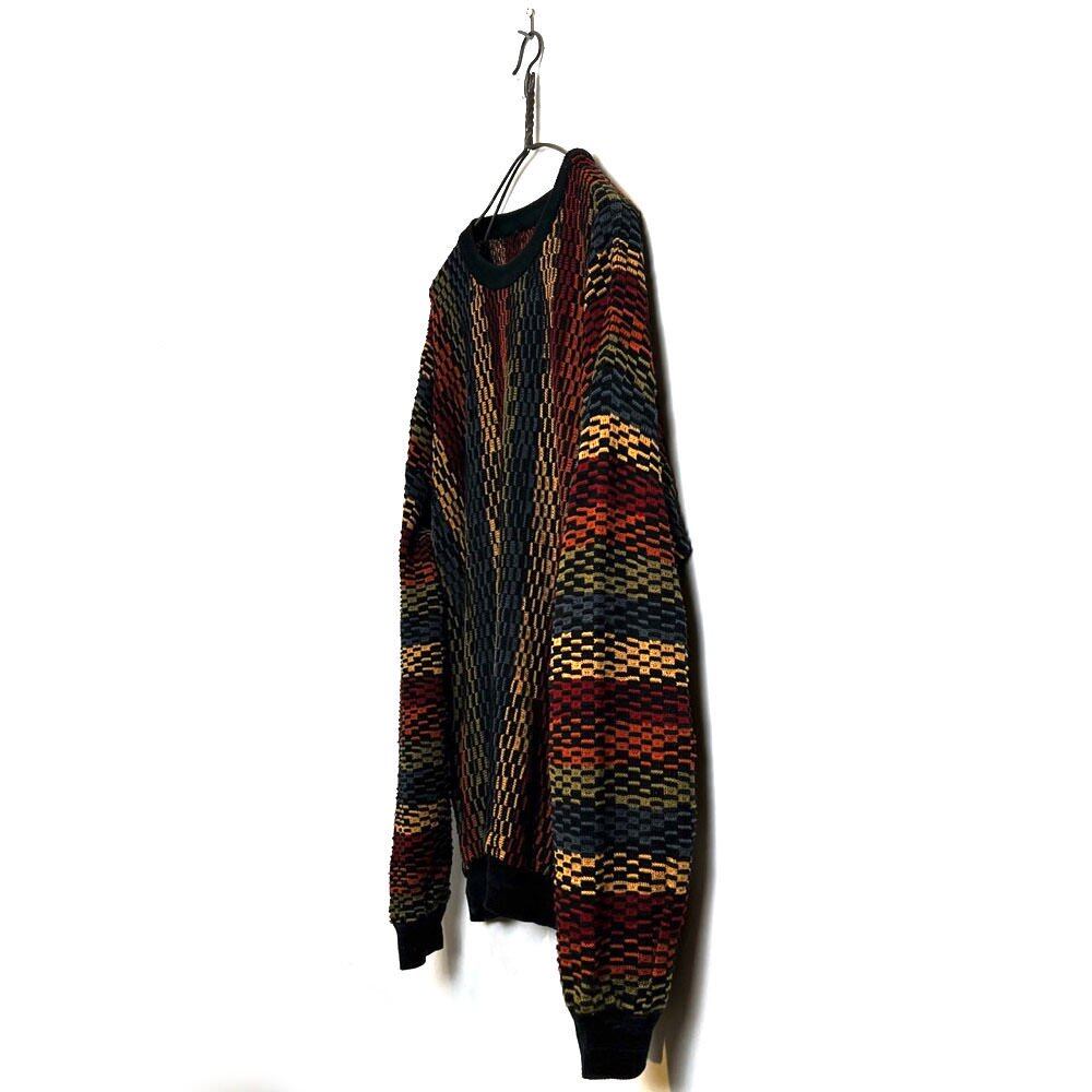 A Canadian cotton sweater from the 90s. The black and multi-colored stripes make for a great color combination.