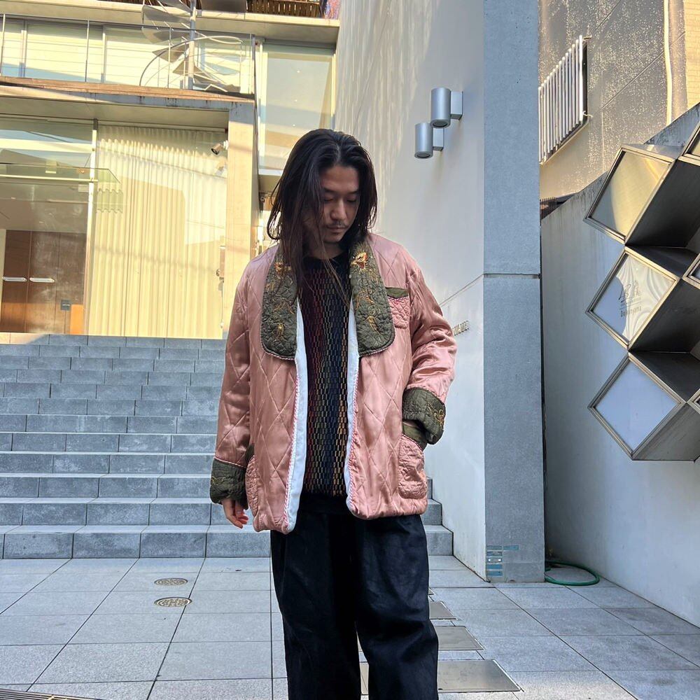 A vintage Japanese robe from the 1940s and 1950s. A quilted rayon satin robe with a tasteful pink beige x olive color scheme and an embroidered dragon on the collar. It is an affordable item, even among souvenir items that have become much more expensive in recent years. It is a good size with a good silhouette and a good amount of room.
