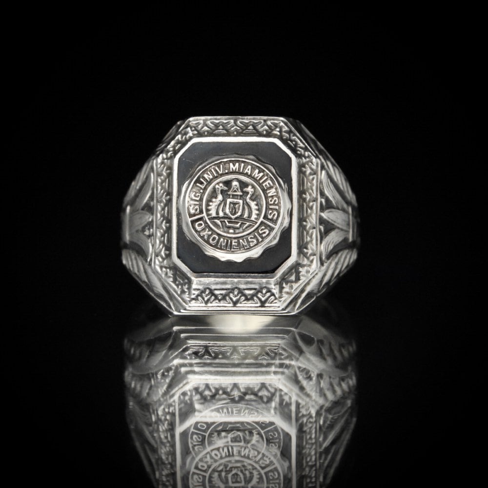 A vintage class ring from the 1940s. The square shape is dignified and typical of this era, and the large onyx top gives it a heavy, mannish look. The intricate craftsmanship that retains the look of Art Deco from the 1930s gives it an antique feel and elegance. It is hard to see, but it is engraved with STERLING. Please check the condition in the photos and be aware of the characteristics of vintage items before purchasing.