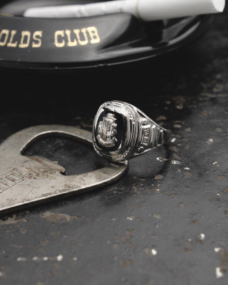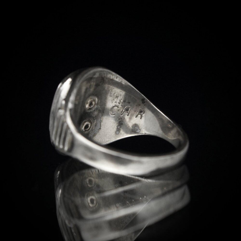 Vintage class ring from 1957. The top silhouette is somewhere between square and round, giving it a sophisticated look while still retaining the mannish feel of the 1950s. The contrast between the medium top and the onyx is eye-catching. Stamped STERLING. Please check the condition in the photos and be aware of the characteristics of vintage before purchasing.