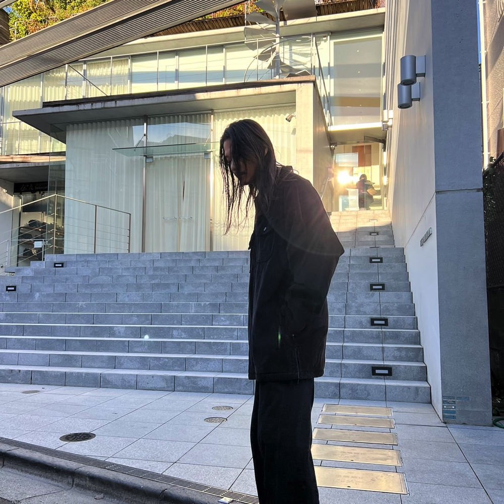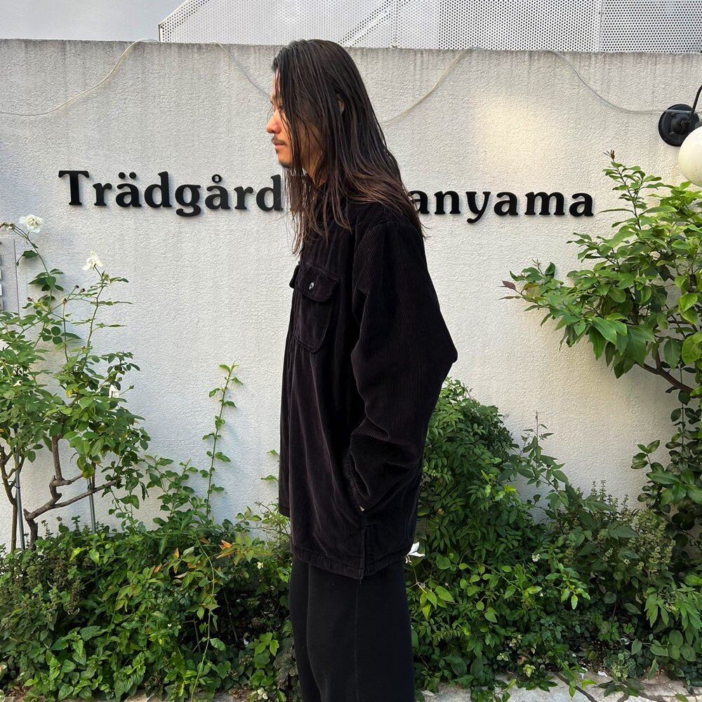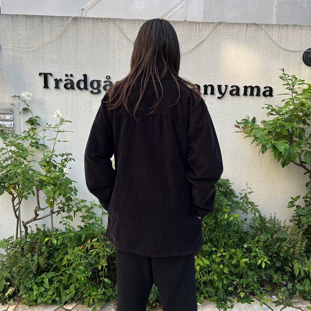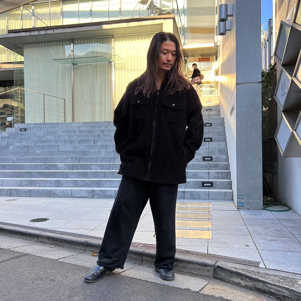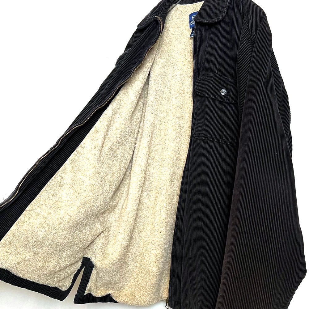 A 90s corduroy jacket with fleece lining for winter wear. The black corduroy fabric has a nice faded look due to aging, and the design is sporty and zip-up. The fit is just right and roomy.