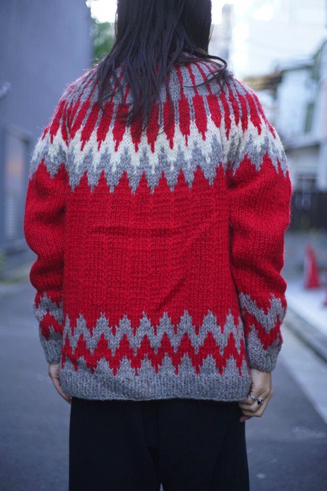 The garment is made from wool with a natural, long texture, and features a rough knit that is unique to hand knitting and an authentic Nordic pattern that gives it a gentle look.