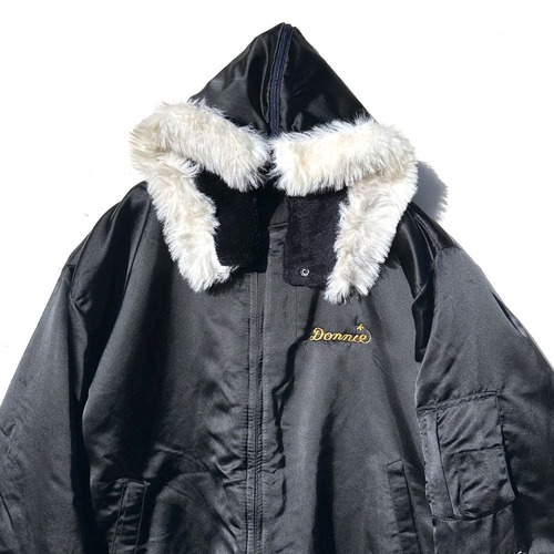 The snap button on the hood is missing and there is wear on the left shoulder.
