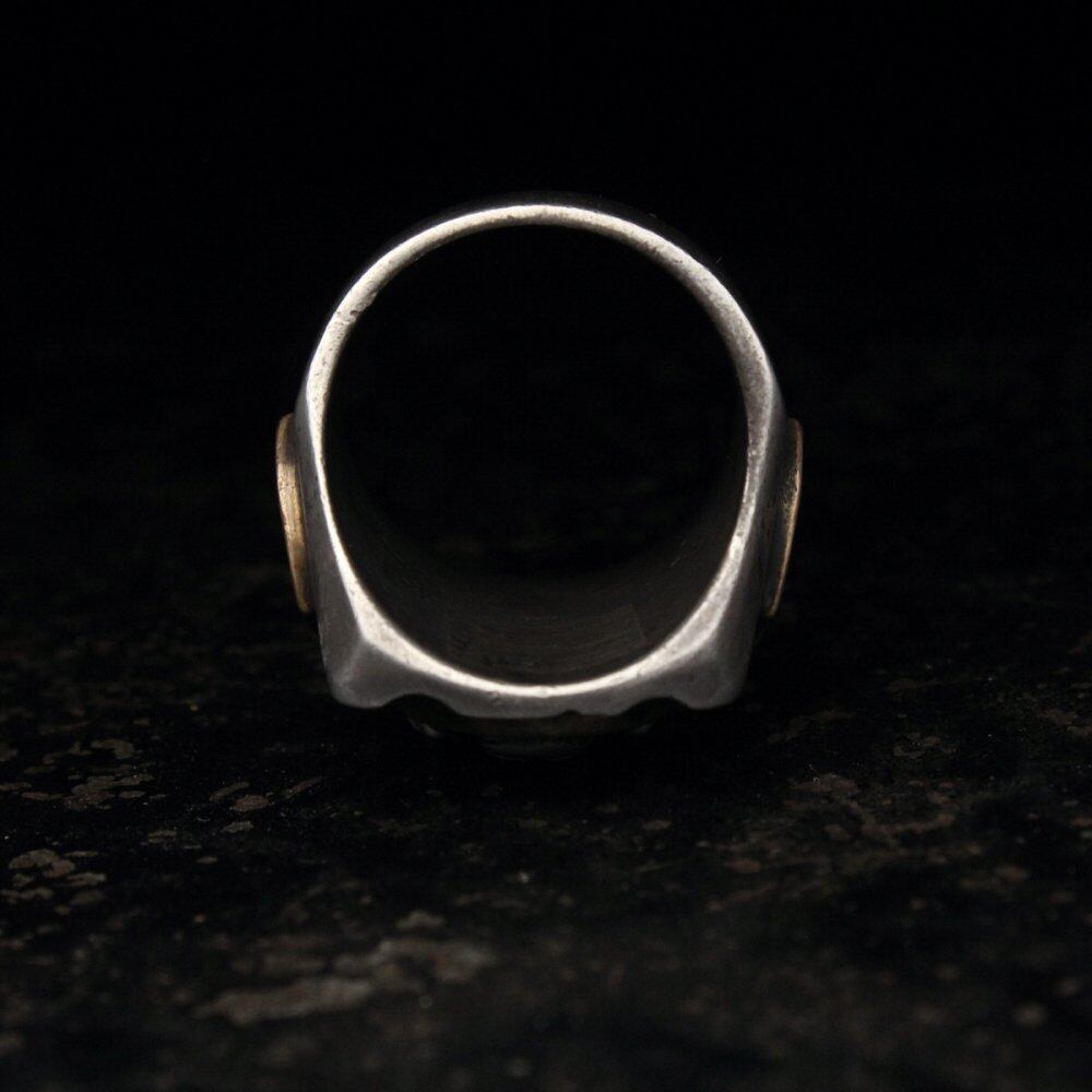 The Mexican Revolution in the early 1900s caused the value of coins (pesos) to be lost, and the excess coins were melted down and made into rings. In the 1940s, members of biker clubs who hung out on the Mexican border would wear these rings instead of brass knuckles, which were banned at the time, and they came to be called biker rings or duster rings. This ring is probably from the 1960s, and the top has a rare skull motif that combines the traditional calavera skull motif with the biker memento mori idea. The side has a lion emblem reminiscent of British style, and the overall cutting is mannish yet minimalist. It is stamped 925, the top base and the side emblem are made of brass, and the ruby is beautifully cut and has a beautiful color, although I dont know if it is natural. Many are too large, but this is a relatively small size and is a rare item. Please check the condition in the photo and understand the characteristics of vintage before purchasing.