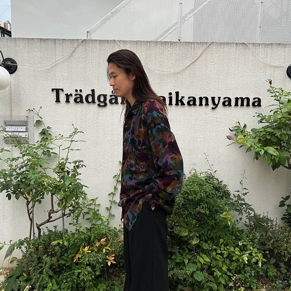 A 90s rayon shirt with a great atmosphere featuring dark abstract botanical art.