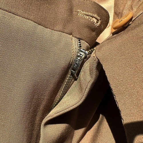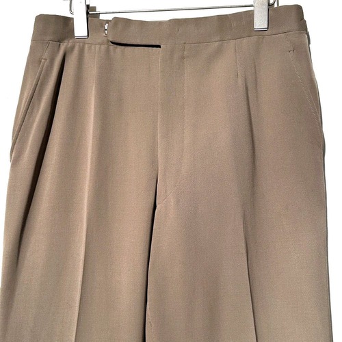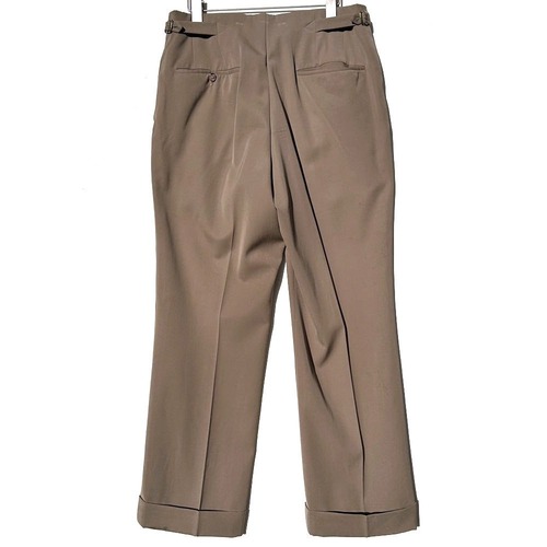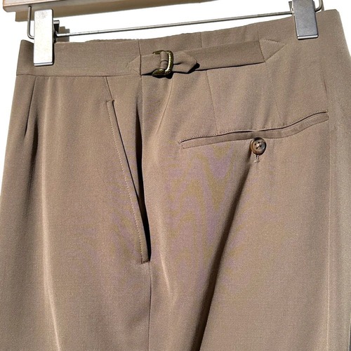 It has two buttons, voluminous lapels, a narrow V-zone and center vent, and a shapely silhouette that retains the masculine feel of the time while also having soft lines that follow the shoulders.The trousers are no-tuck for a clean waistline, and the classic cut has an adjustable belt on the side, and the relaxed straight silhouette gives it an American classic look.