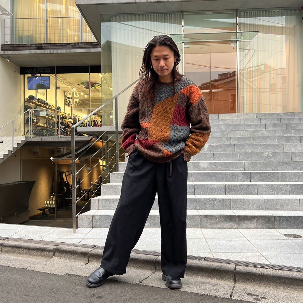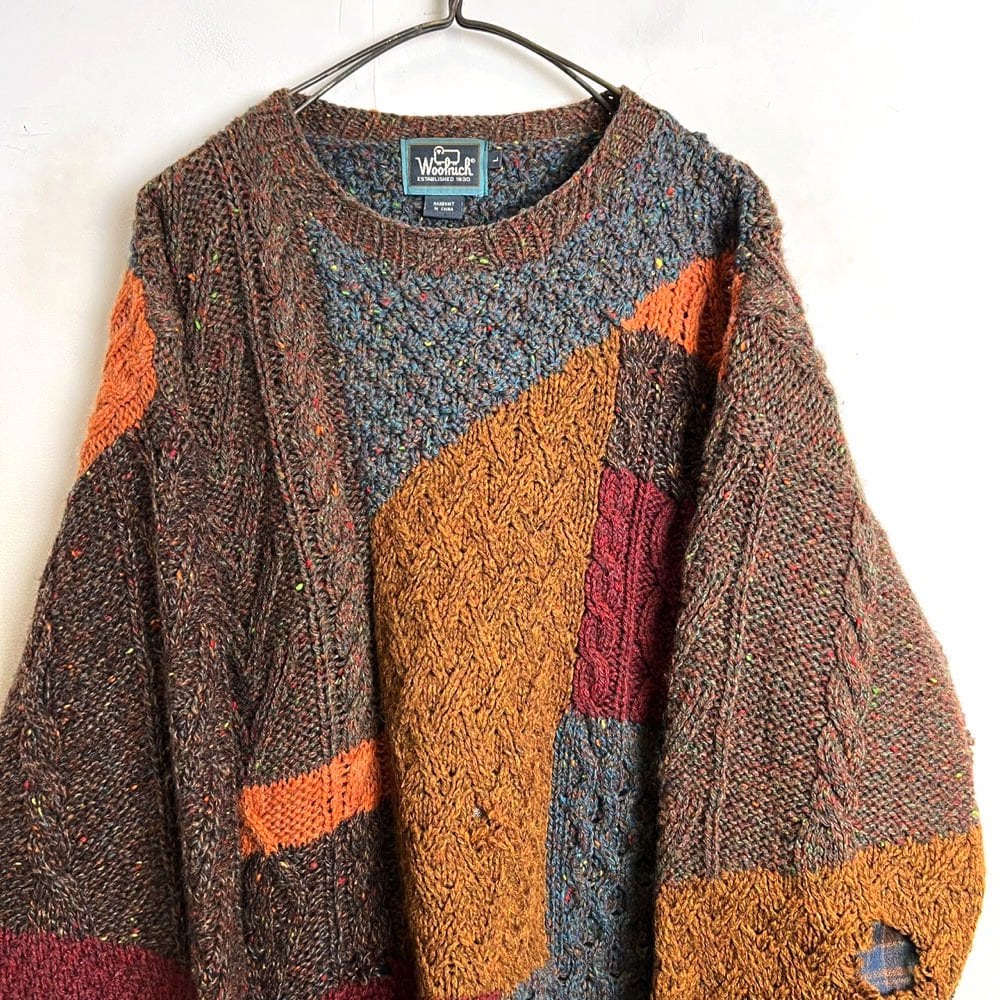 A 90s Woolrich hand-knit sweater. A remade knitwear that makes use of the original damage and has vintage flannel fabric applied to the back. A unique vintage item with a random cable knit pattern, repairs that match the color, and grunge-like damage. A good silhouette with a moderately loose fit.