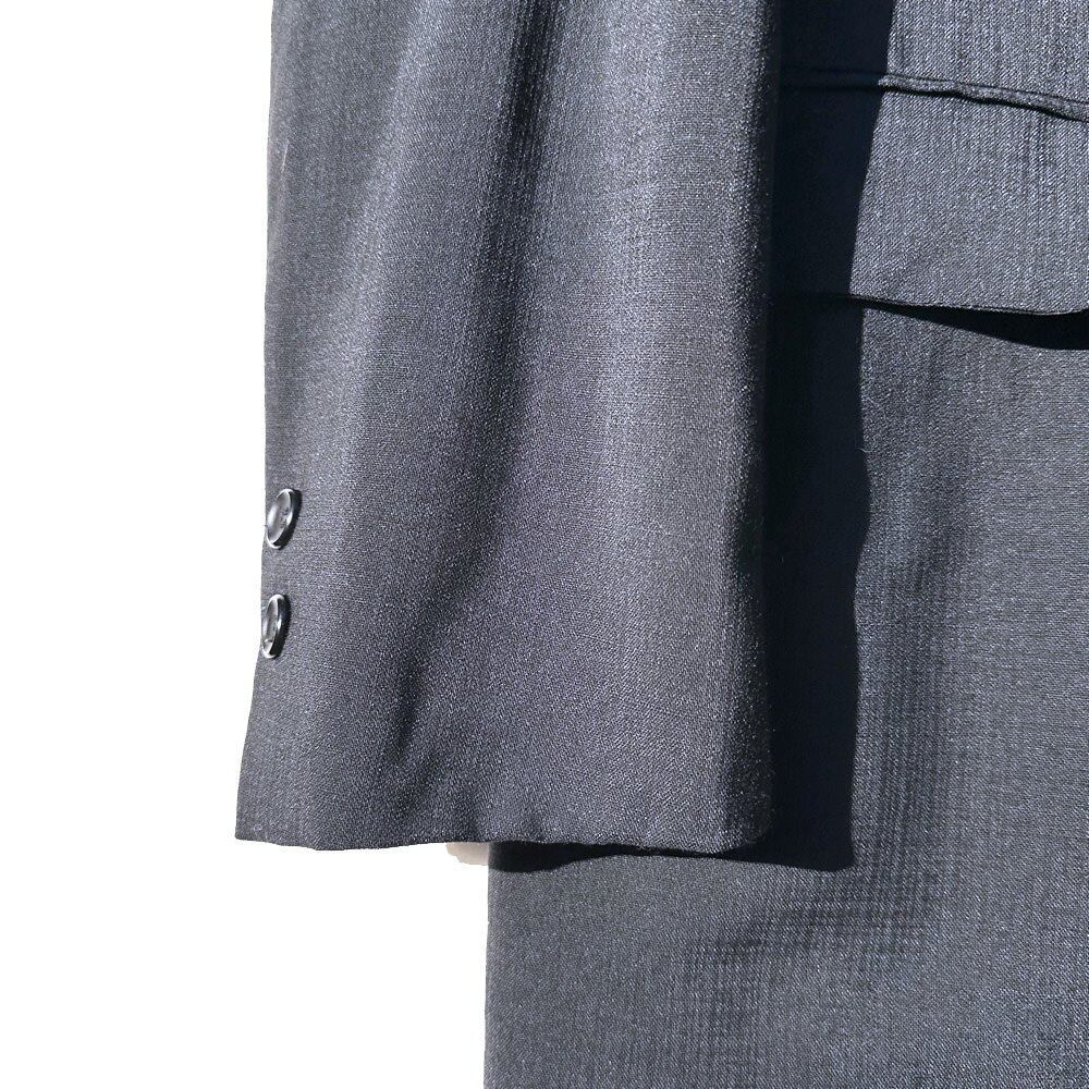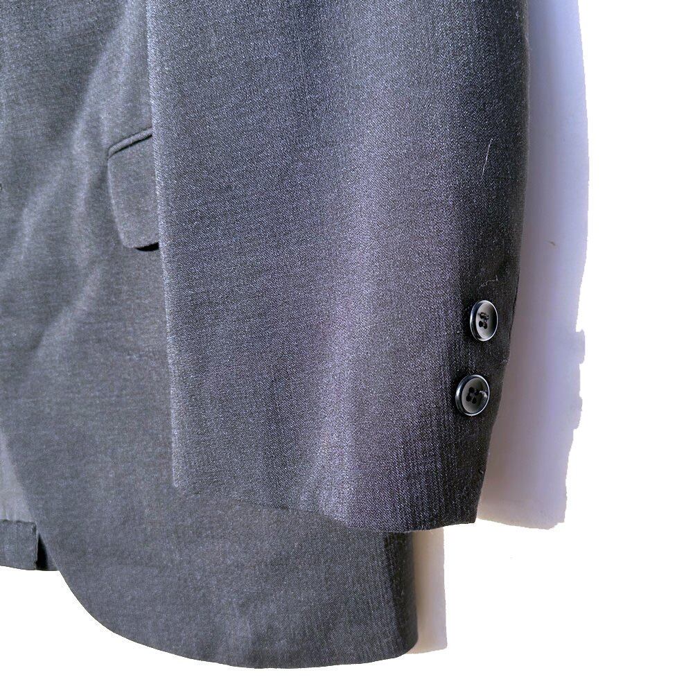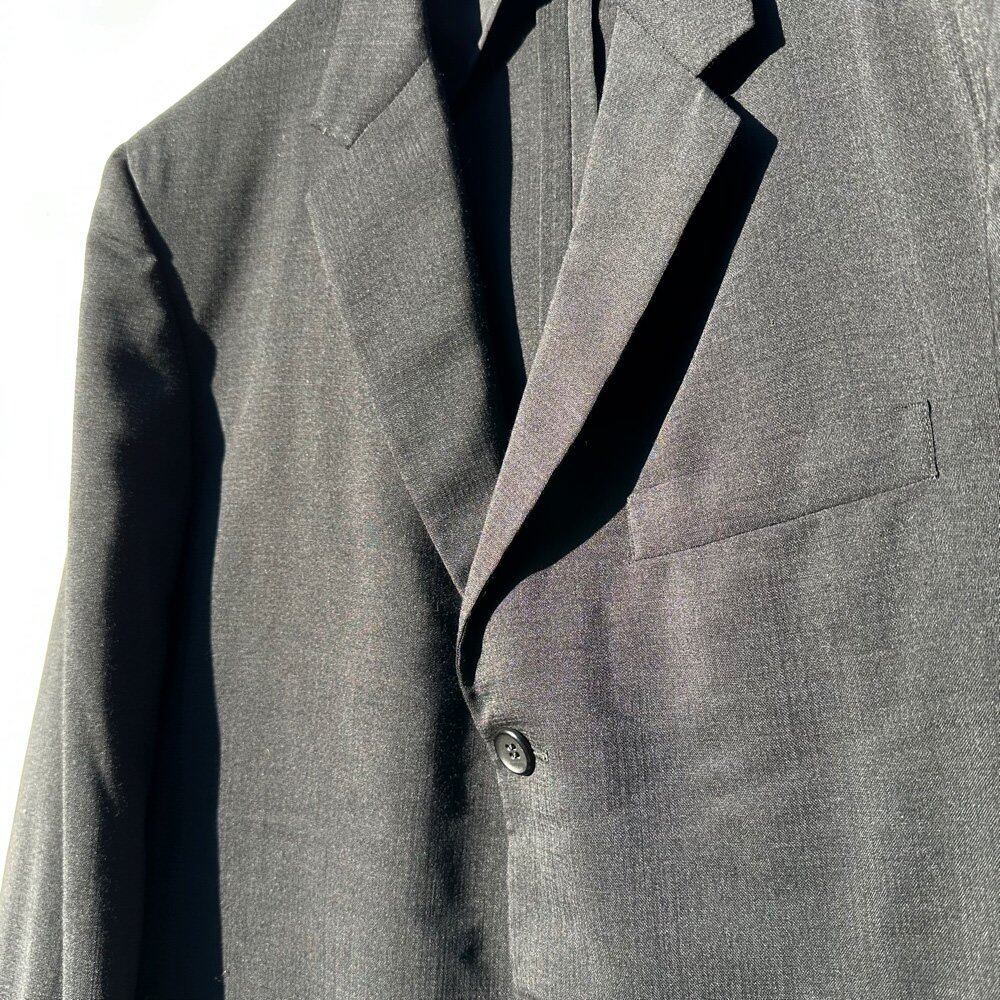 The jacket has three buttons and a vertical, boxy silhouette, and the trousers are no-tuck and slightly tapered, which is a slim fit for the era, but they have a clean look but also a silhouette with just the right amount of adult roominess.