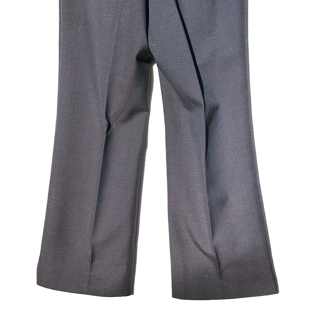 It features two buttons, a deep V-zone and deep center vent reminiscent of the 70s, and moderately shaped lines that retain the masculine feel of the time while also having soft lines that follow the shoulders.The trousers are no-tuck for a clean waistline and have a powerful flared silhouette for a sexy look.