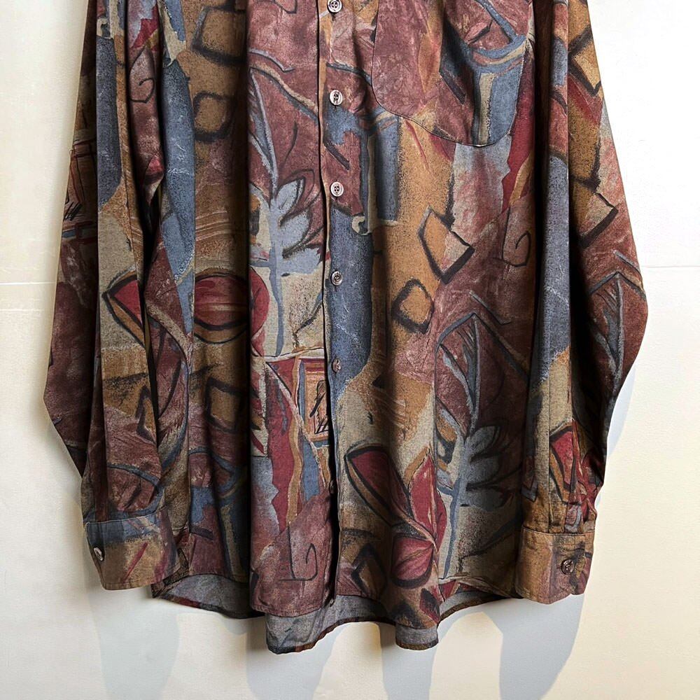 A 90s art shirt with a nice atmosphere featuring an abstract art print based on grayish brown and khaki colors. The rayon and polyester fabric has a moderate firmness but also a smooth drape, giving it a nice texture. It has a loose, relaxed silhouette.