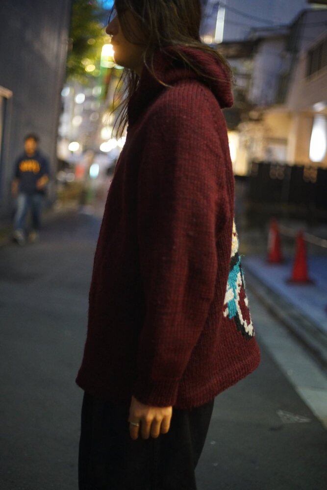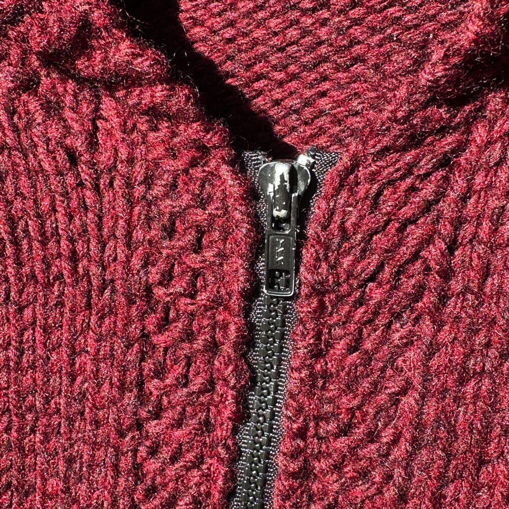 The knit fabric used is thick and tightly woven, like a Cowichan sweater, giving it a luxurious appearance.