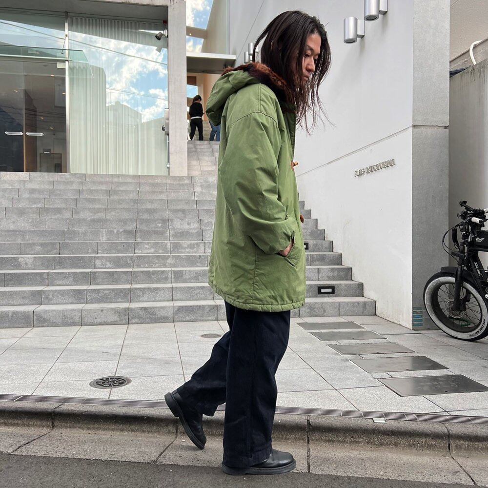 This cute piece has a light olive color front reminiscent of a 1940s Euro vintage duffle coat, and a mustard color quilted liner.