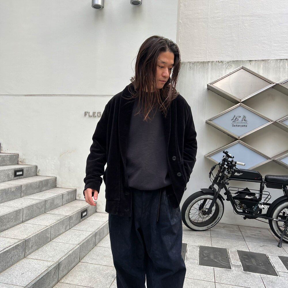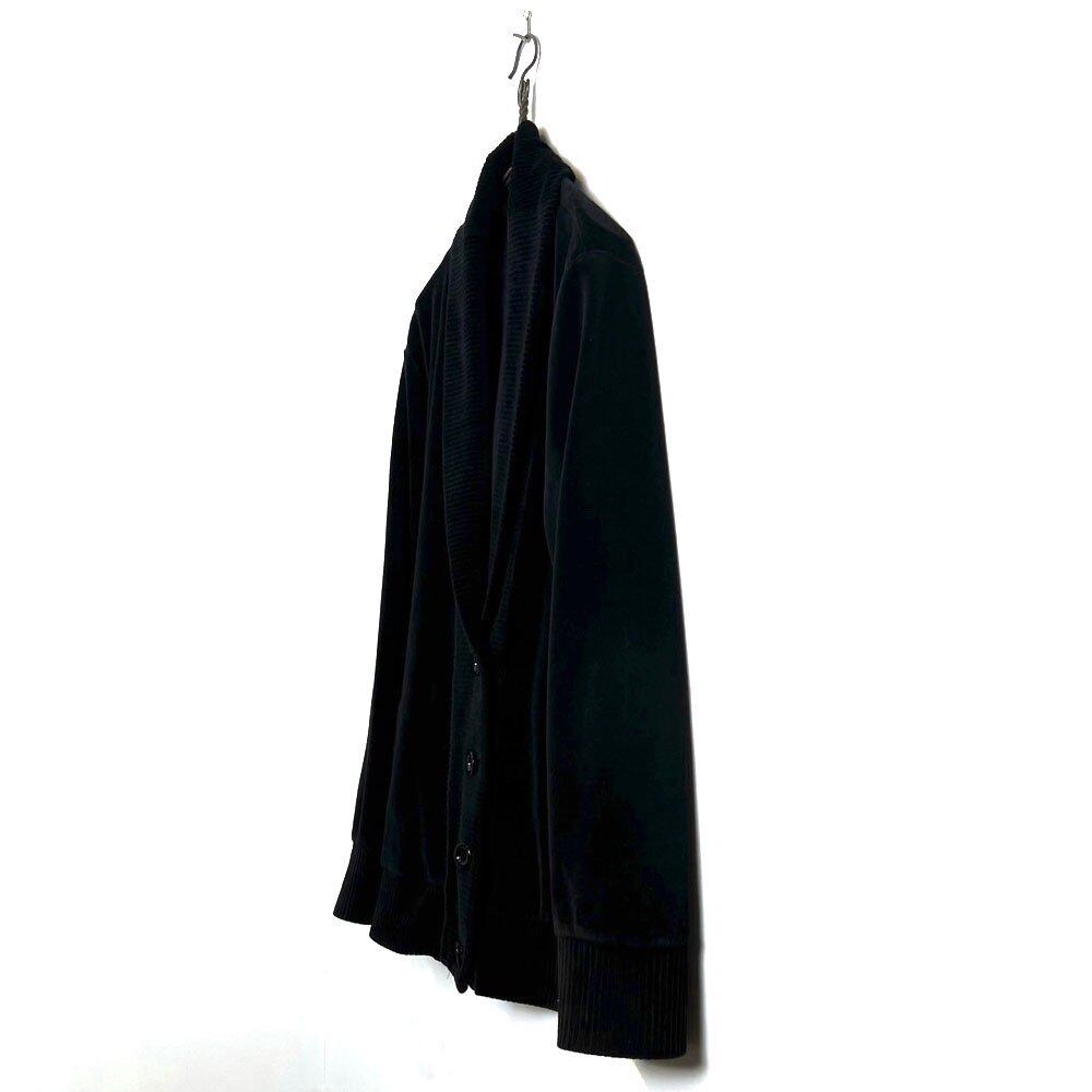 A 90s shawl collar velour cardigan made of stretchy velour fabric that is comfortable to wear. The collar, hem and cuffs are switched with corduroy ribbing, making this a unique mixed material design. It has a good size with just the right amount of room, and is recommended as a light jacket for early spring.