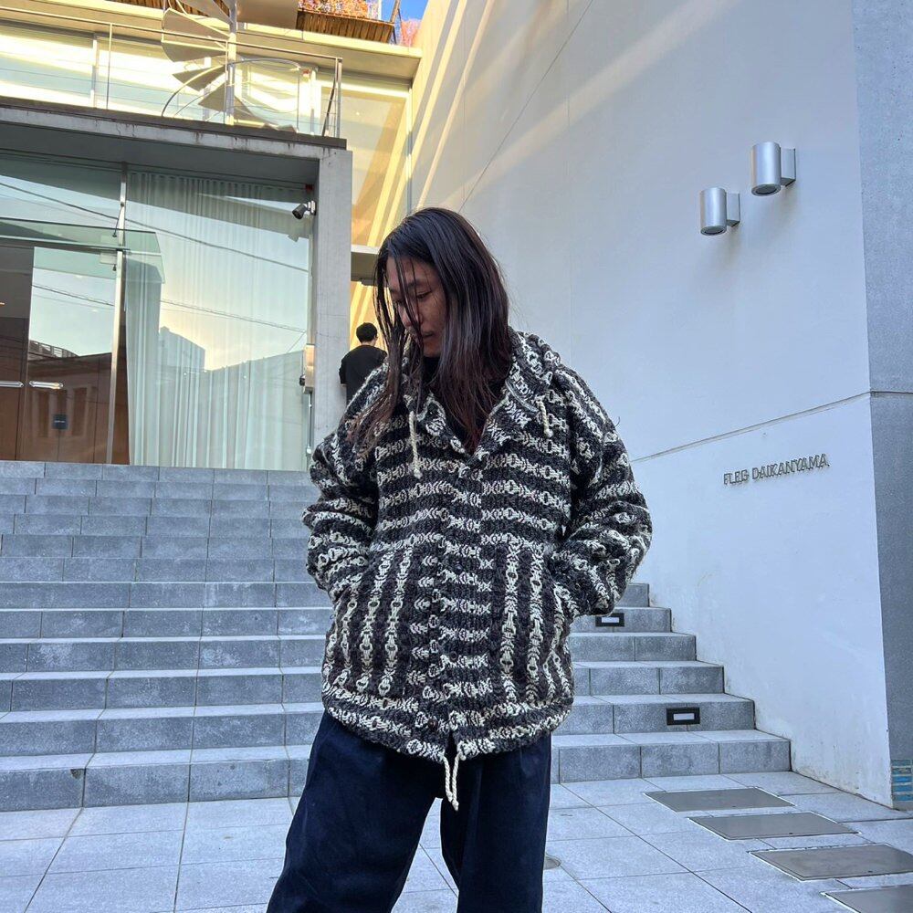 80s knit hoodie. At first glance, this knit outerwear has a Mexican hoodie-like feel. The knitwear has a rough texture and is easy to match with other items in white, gray, and black. This is a great piece. This is a lightweight wool knit with a low itchy feel, and a comfortable fit.