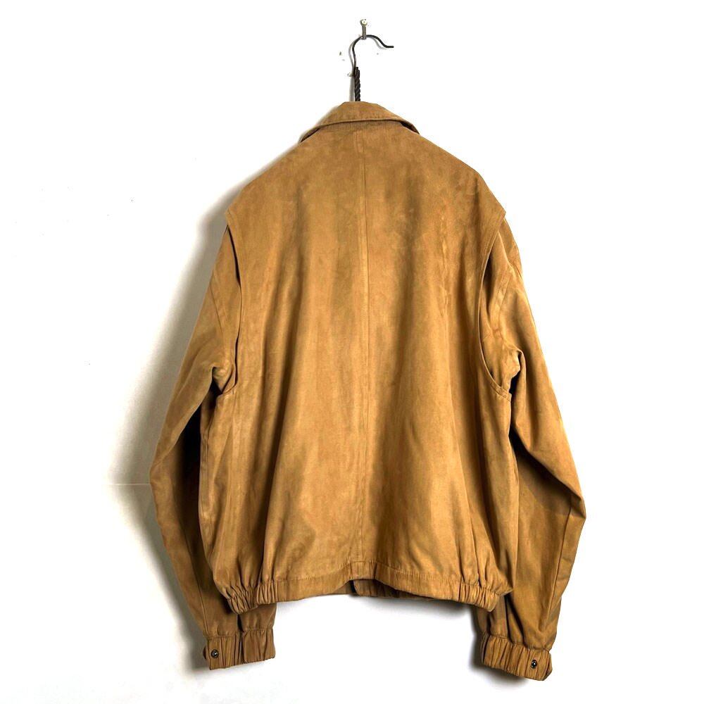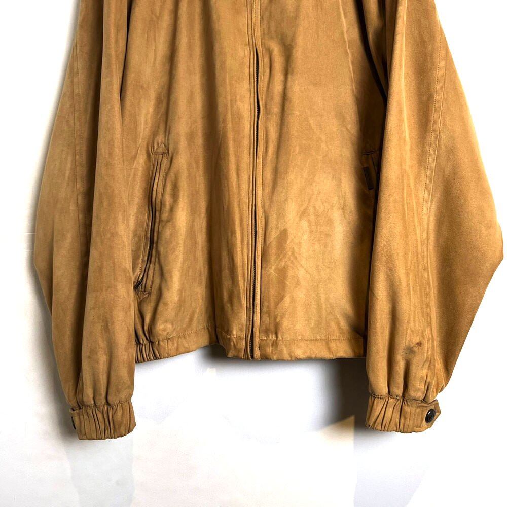 90s faux suede jacket. This item is made of polyester fabric with a brushed finish, giving it a smooth suede-like texture. The smoky camel color gives it a sophisticated, mature feel. This item is a good size with a moderate amount of room.
