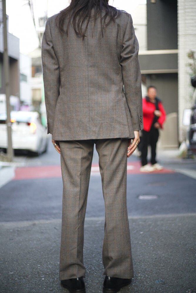 The jacket has two buttons and a moderately shaped, vertical silhouette, while the trousers have a straight silhouette with no pleats, creating a beautiful line that falls diagonally from the thighs, making the legs look long and beautiful.