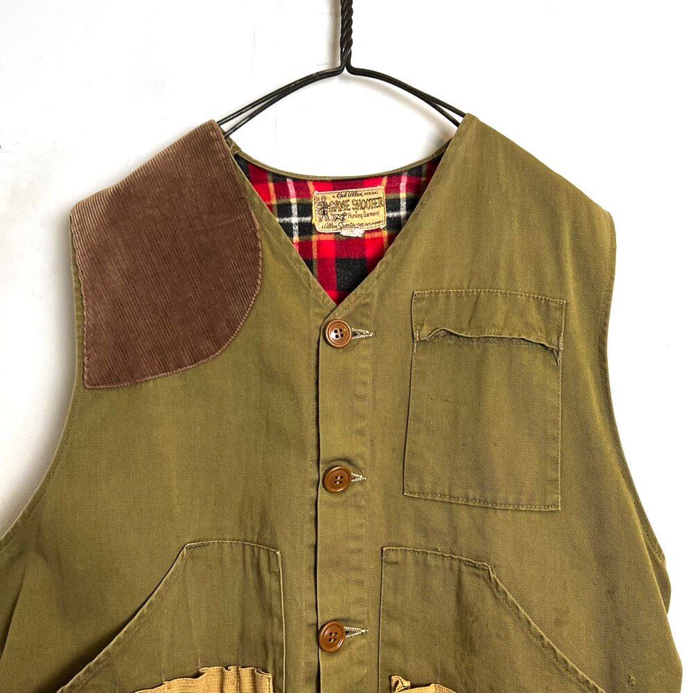 A hunting vest from the 50s. The khaki olive color has aged nicely, and the corduroy patch on the right shoulder is a nice design accent. The length is 54cm in the front and 65cm in the back, making for an interesting silhouette with different lengths at the front and back. It has many pockets, is practical, and can be worn all year round. A useful vintage item.