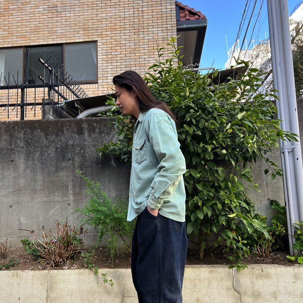 A 1940s loop collar corduroy shirt. This shirt is made of finely ribbed cotton corduroy fabric that has softened over time and has a nice mint color. It has a good silhouette and a roomy fit.