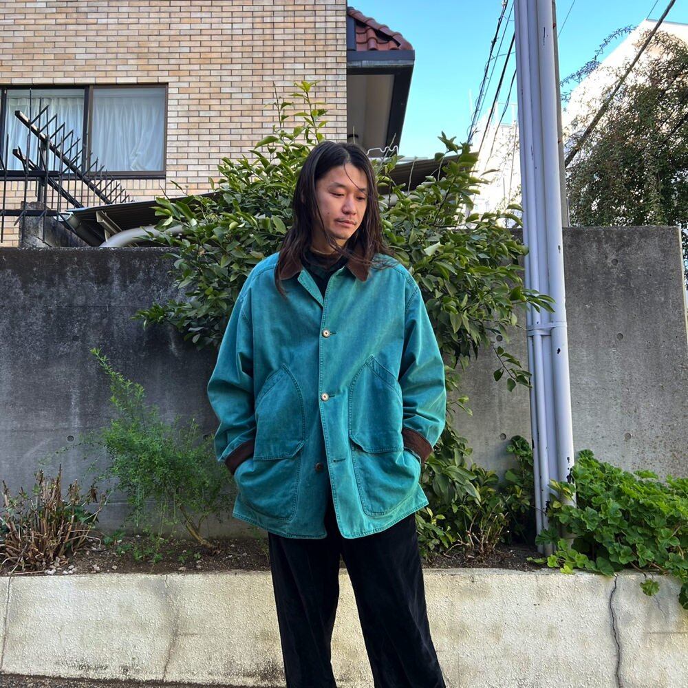 Eddie Bauer field jacket from the 90s. The faded bluish green color has a nice color tone. It is a single-layer cotton jacket with no lining, making it suitable for a wide range of seasons. It has a moderately loose fit that you can wear loosely, and a relaxed silhouette with nicely dropped shoulders.