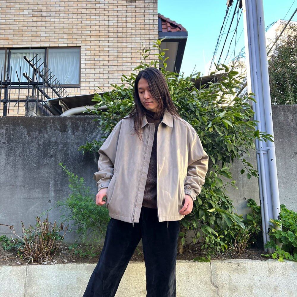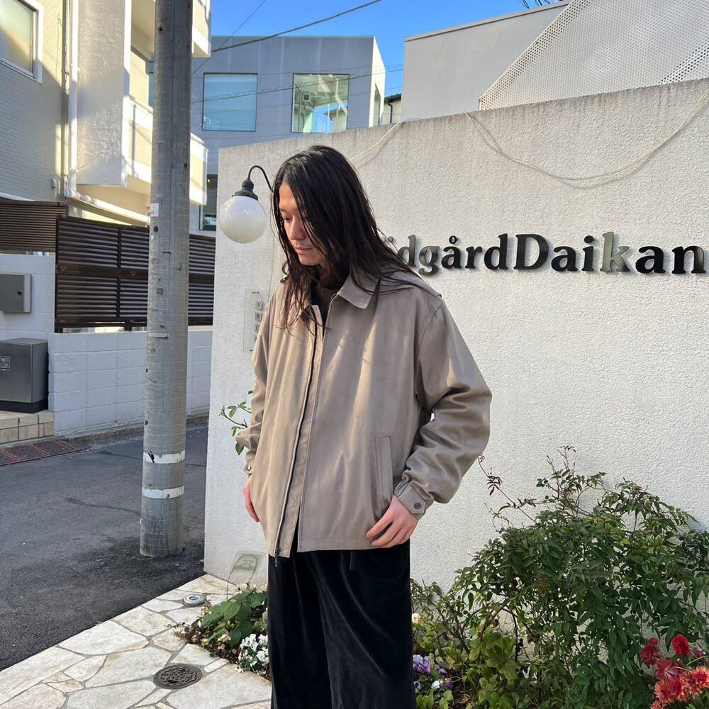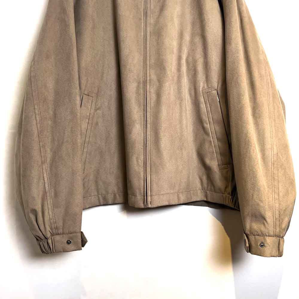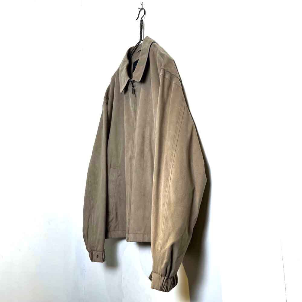 90s faux suede jacket. This item is made of polyester fabric with a brushed finish to create a smooth, suede-like texture. The sophisticated grayish beige color gives it a calm, mature feel. This item is a good size with a moderate amount of room.