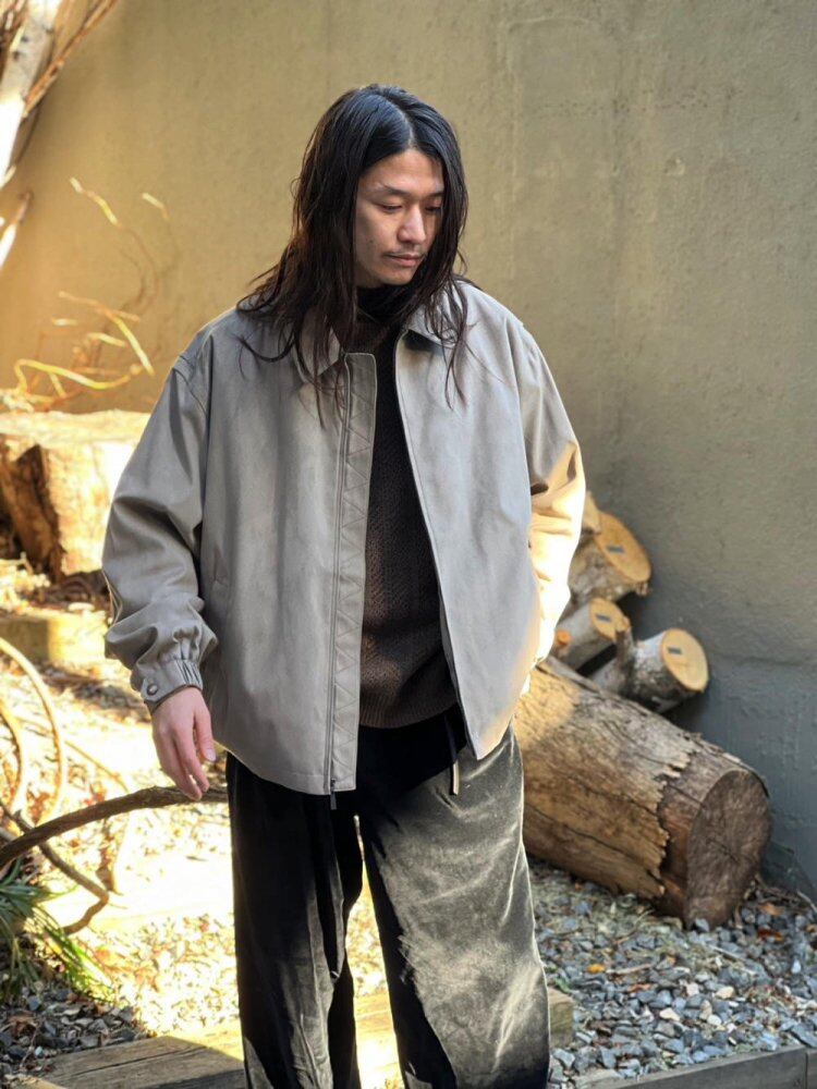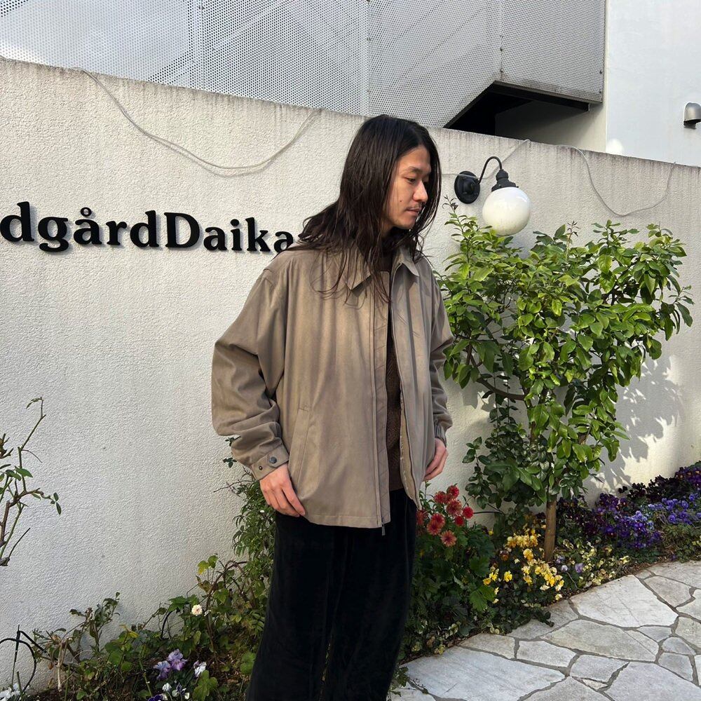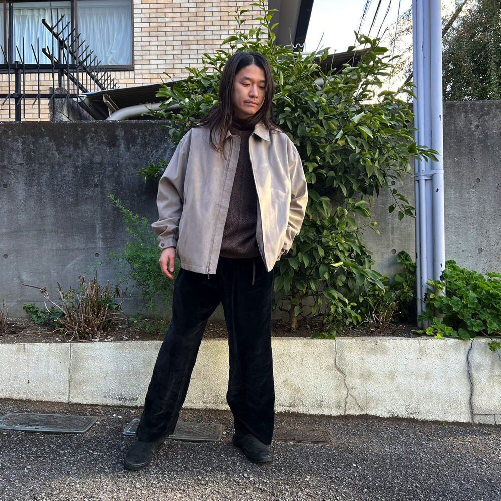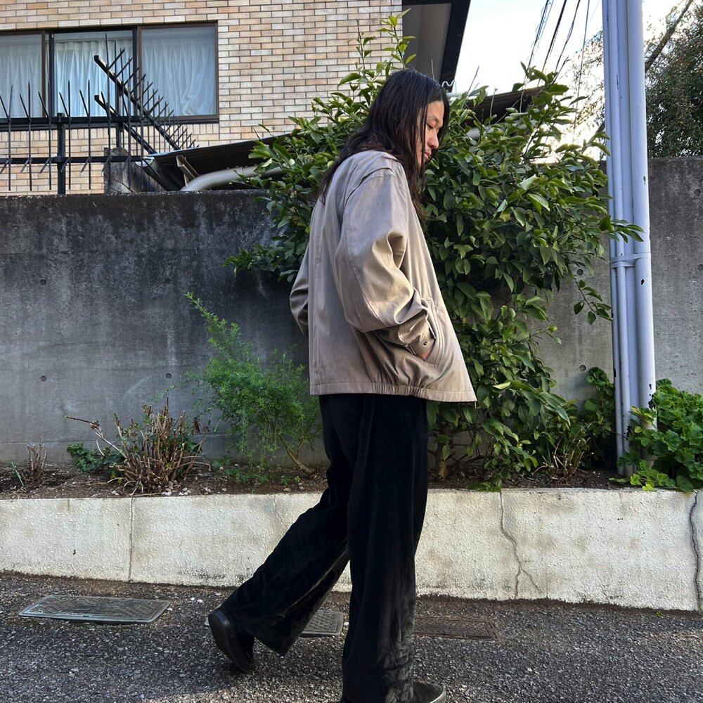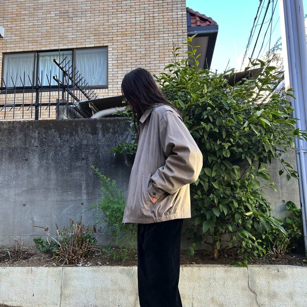 90s faux suede jacket. This item is made of polyester fabric with a brushed finish to create a smooth, suede-like texture. The sophisticated grayish beige color gives it a calm, mature feel. This item is a good size with a moderate amount of room.