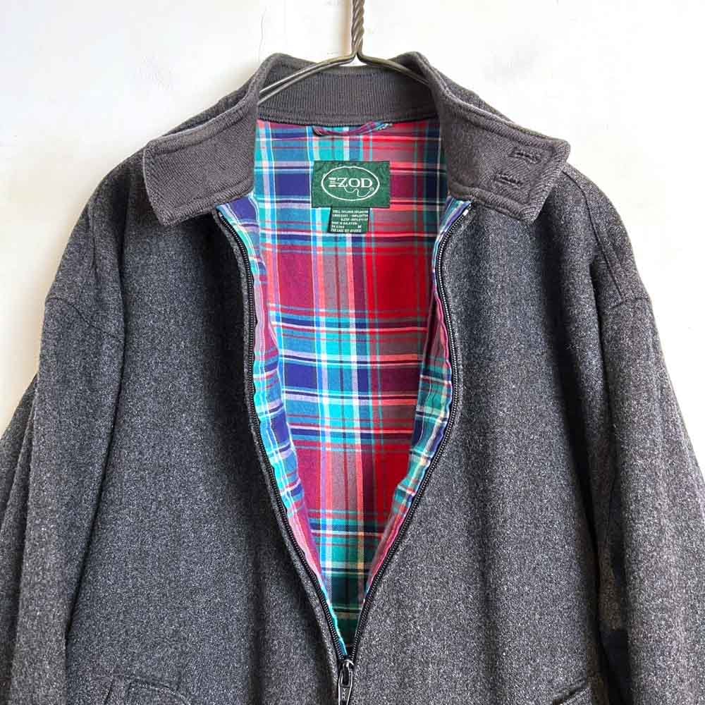80s IZOD stand-up collar wool jacket. Sporty stand-up collar design with mature charcoal color and bright blue x red madras check lining. A comfortable fit and a good silhouette.