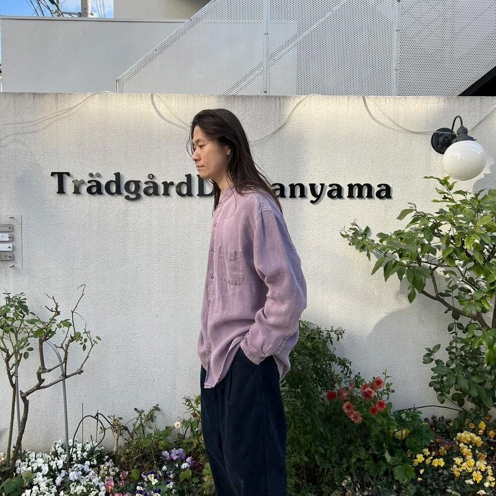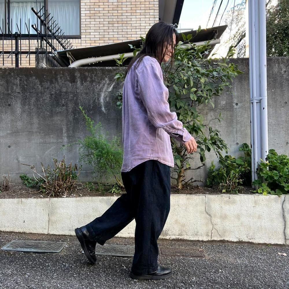 A 90s band collar hemp shirt. The soft linen texture and kasuri fabric with a napped feel create a nice atmosphere. The faded pale purple color is a nice spring color. It has a good silhouette and a roomy fit.
