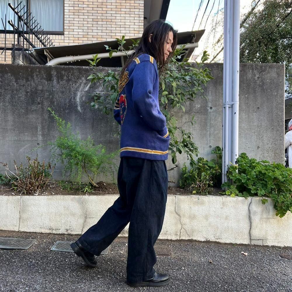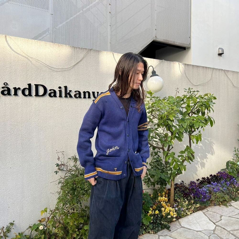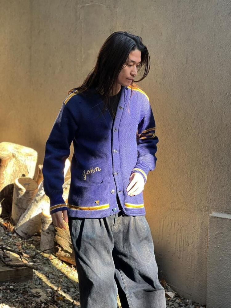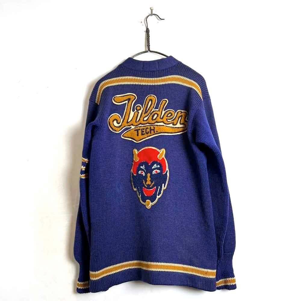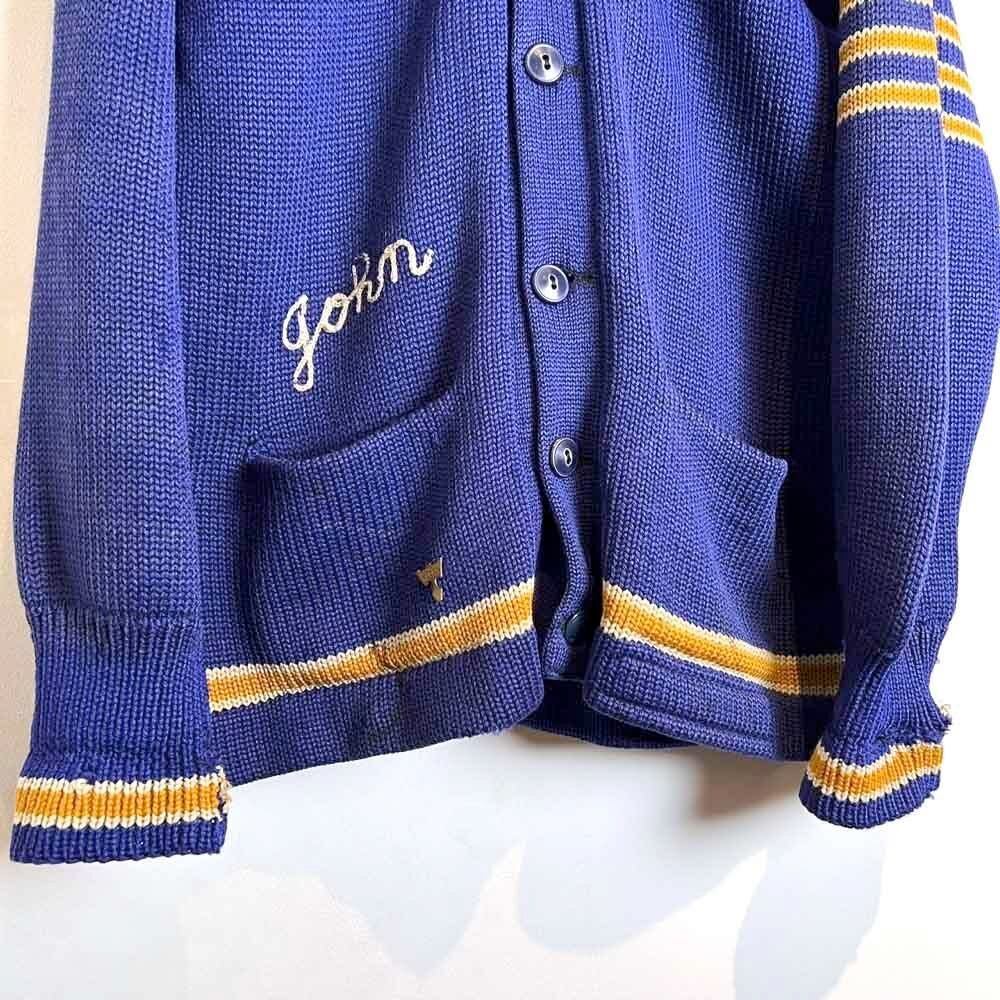 This 1940s lettered cardigan has a faded navy with tasteful yellow lines and a lettered and devil patch on the back, giving it a really cool look. Its slim fit and can be worn by both men and women.