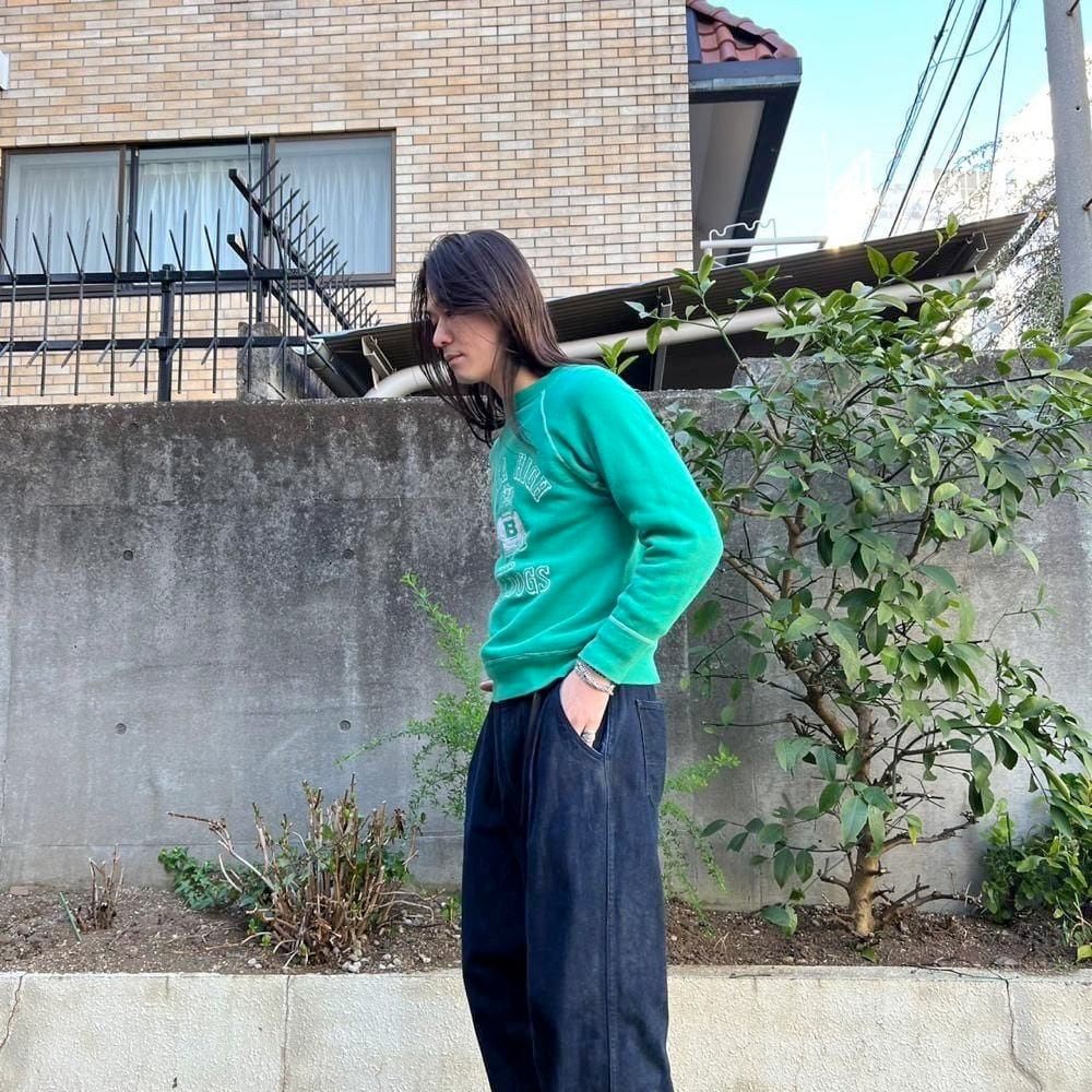 A 1960s sweatshirt of the Bulldogs, the football team at Bellaire High School in Ohio. The green color has faded nicely over the years, and the print has a nice cracked look. The 100% cotton body has a nice, worn-in feel, and the slim fit makes this a great piece for women too.
