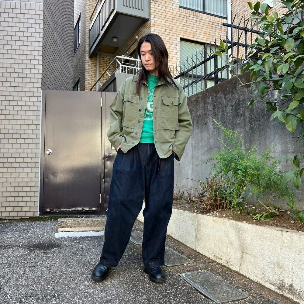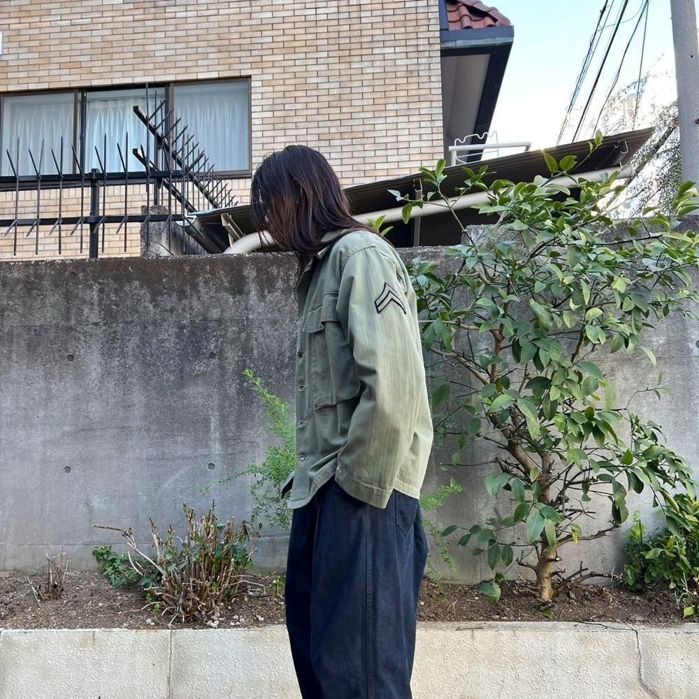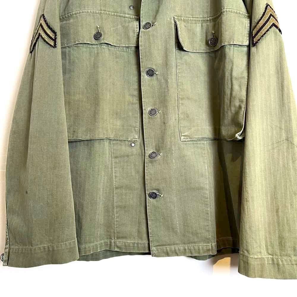 1940s US military herringbone twill utility jacket. The fabric has become soft and worn over time, giving it a nice texture. The gas flap, which is a hindrance when worn in real life, has been removed, making it easier to wear. I cant confirm the size, but it feels like its about size 38 (equivalent to size L).